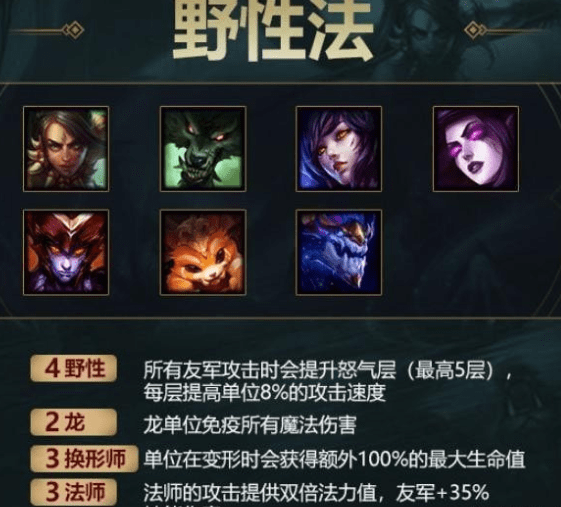 新手刚刚接触游戏时往往容易拿很多彼此没有任何联系的棋子,导致最后自己的阵容四不像。所以新手用户至少先熟悉一套阵容,弄懂该阵容中应该拿哪些棋子。这里给新手推荐一套狂野龙法的套路,7人口即可成型。前期尽力搜豹女、狼人,中后期核心龙王、纳尔,后期不需要存钱,尽力追星即可,非常适合新手用户。