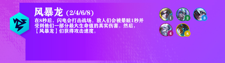 敌人们会被晕眩1秒并受到一部分最大生命值的真实伤害,风暴龙们获得随羁绊层级提升的攻击速度