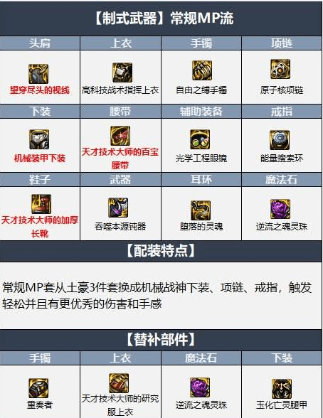【配装特点】:常规MP套从土豪3件套换成机械战神下装、项链、戒指,触发轻松并且有更优秀的伤害和手感