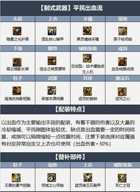 【配装特点】:以出血作为主要输出手段的配装,有着不错的伤害以及大量的冷却缩减,平民刷图体验较优,缺点是出血需要一定的时间结算,戒指可以稍微缩短一点结算时间,注意下装选择对应属强有对应异常自定义上衣也可使用(出血伤害+30%)