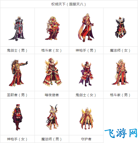 职业:男女枪手、男女鬼剑士、男女格斗家、男女魔法师、男女圣职者、暗夜使者、守护者、魔枪士、枪剑士