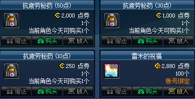 1000点券可以购买30疲劳药,每天限购一次,未使用的道具每天凌晨6点删除。