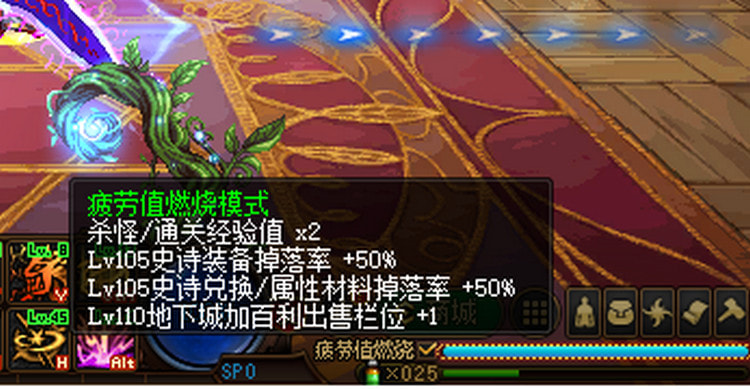 在开启燃烧的状态下进入地下城时,疲劳值消耗变为2倍。