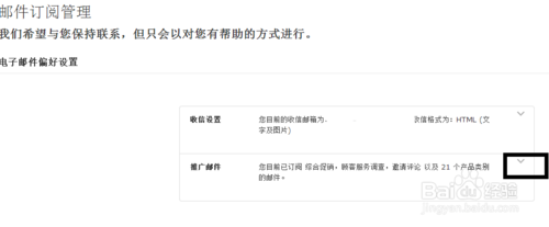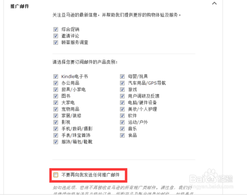 下拉页面,选择“不要再想我发送任何推广邮件”,此时上面的各个项目的选项将会变成灰色。提交保存即可。