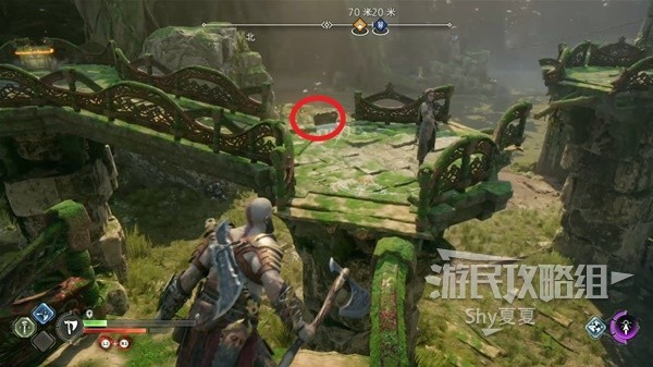 上来以后,红圈处有一个小屋子,里面有植物陷阱,破坏掉可以打开一个宝箱,打开获得【关键物品-露恩达的破碎臂套】。然后跳到左边的台子上。