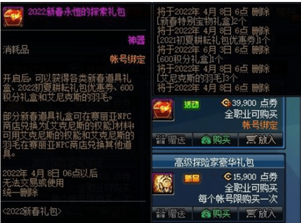 2022春节礼包只有39900点券的档次,和2021有圣者遗物箱搭配的不同。首套购买时可以获得首套购买礼包,礼包中包含一张7折优惠券和一个武器装扮特选礼盒。