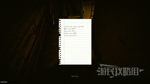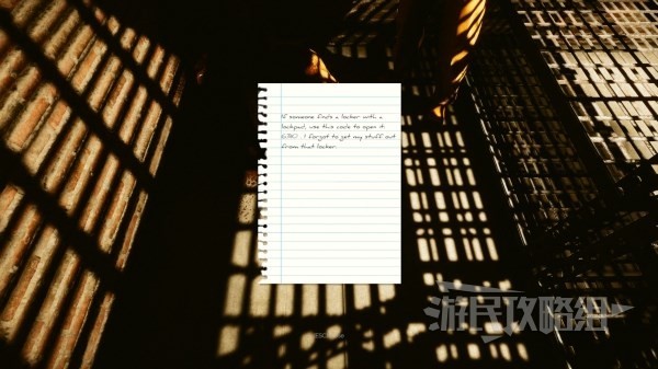 首先需要从柜子里找到金属探测器,开启柜子需要拿到密码,密码在一具黄衣尸体旁边的纸条上。这具尸体在一个房间里(与其它房间连通),需要钥匙才能进入房间。密码的样子如下图所示。