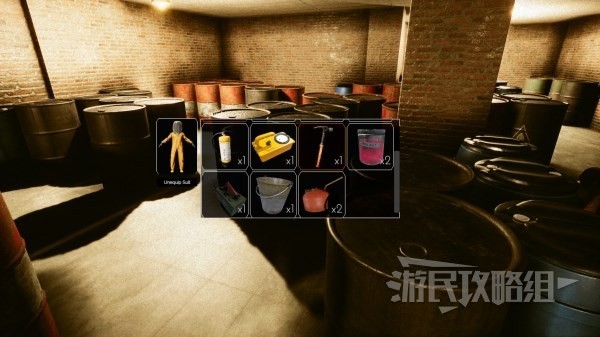 现在去给汽油罐加油,从初始门的位置开始,进入左侧第一个走廊上的房间,房间里有许多油桶,大部分桶都可以互动但是全都是空的,只有一个是装满油的,找到装满油的油桶,灌满汽油罐(灌满之后会出现黑色标记,下图中的汽油罐只出现两个是因为队友拿了第三个,总共持有数量应该是3,将3个汽油罐全部装满)。