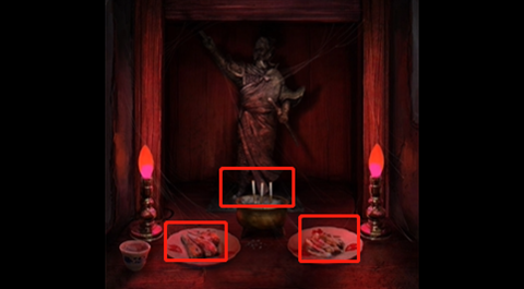 4、从刚进门左边的石狮子、进来的鼎上、进来之后左右两边场景门上的黑白无常记忆正殿里面的功德箱中,找到“正”字的线索,解开被锁关起来的门。