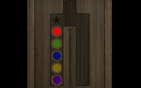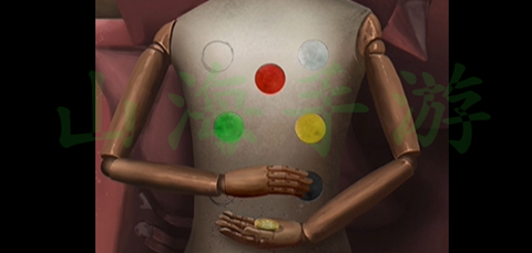 4、再使用螺丝刀撬开右边柜子上和右边桌子上的铁盒子,获得红黄两个木块,然后放到木偶身上,正确摆放如图所示: