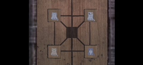 11、随后移开功德箱这里的蒲团,将黑白勾玉放上去,并且按照如图所示,完成解谜,就能打开通往地下室的密道。