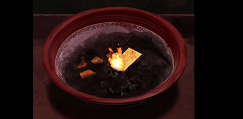 17、最后将猪剪纸拓印和其他的两张剪纸一起放入地下室的火锅中,随后根据火锅中显示的六艺顺序,使用火柴依次点燃外院中鼎里面的香。