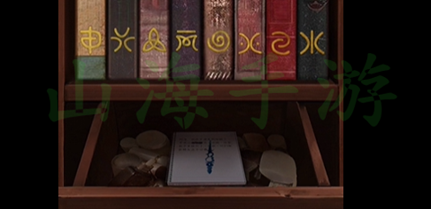 7、按照破损的照片排列书架上面的书,然后就能打开下面的抽屉,获得钟表的指针,并且把指针放到钟表上面,点击钟表下面两个按钮左边的按钮,调整到九点。