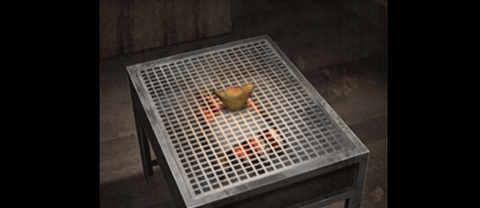 21、然后回到阳台,在烧烤架中放入木炭、棉布、酒精,使用打火机点燃,放上面元宝,完后游戏后烤制成功。