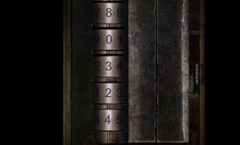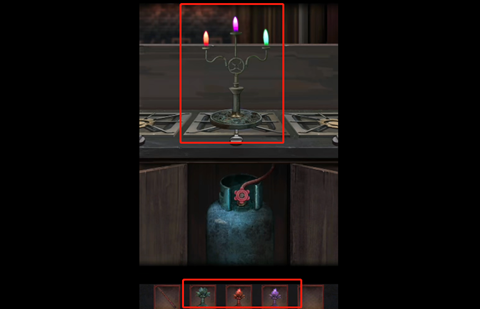 7、在有磨刀石的房间中将生锈的剪刀打磨好,然后剪开用绳子绑着的门,进去打开箱子上的机关获得酒瓶,机关正确解法: