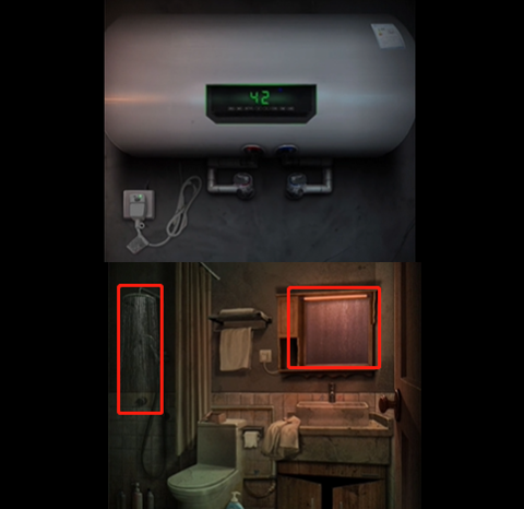 2、然后进入娱乐室,将左上角的热水器插上电源,在进入浴室打开花洒,这个时候镜子上就会出现冰箱盒子的密码:1215