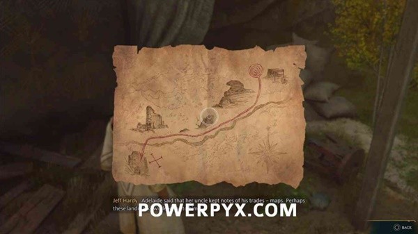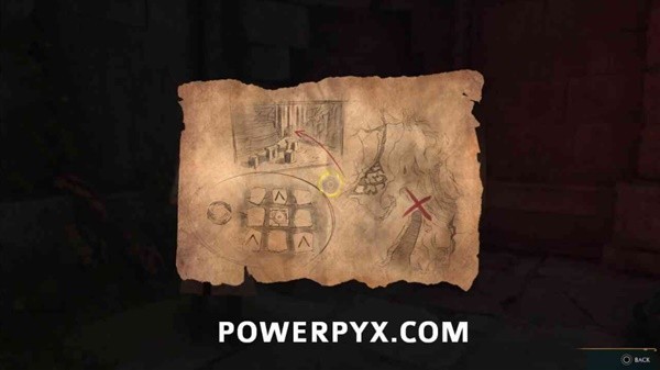 查看藏宝图,右上角的红圈是藏宝图的获取位置,红线是行进路径,左下角的红叉是目标地点。