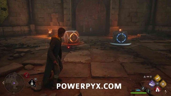 进入坟墓,一直往前走来到有3个蝴蝶印记的门。用咒语【荧光闪烁】将3个蝴蝶引过来开门。门右侧房间有2个,门左侧房间有1个(这个需要用飞来咒搬动箱子然后爬上去)。