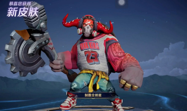 制霸全明星是牛魔当初的秒杀皮肤,现在很难有途径买到。这款皮肤是身穿篮球服的牛魔,特效非常给力,会有汉堡飘出来。不过全明星的手感和西部大镖客差不多,现在没怎么看到人用了。