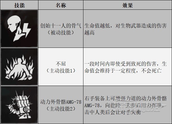 克里斯的技能搭配起来会产生很好的效果。其被动技能【创始十一人的骨气】令他在生命值越低的情况下对生物武器造成的伤害更高,而【不屈】则令他能在受到致命伤害后不死,将这两个技能结合起来,血量过低时激活【不屈】,再利用被动技能的加成效果就能对敌人造成高额伤害。【动力外骨骼AMG-78】也能够对敌人造成巨大伤害。