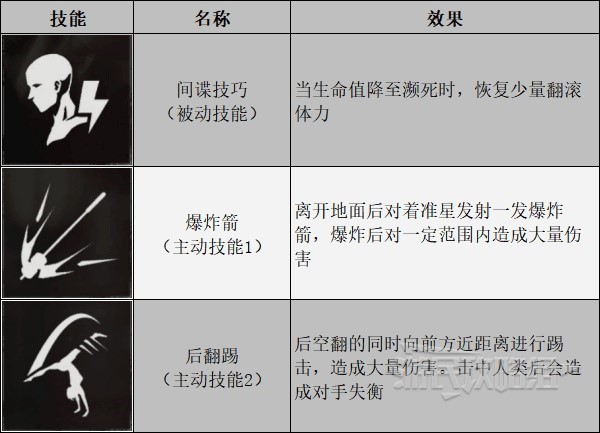 艾达的被动技能让她能够在血量较低时恢复少许体力,这一加成还是可以派上用场的,因为多一些体力就能多用一次翻滚,成功躲开敌人的攻击后就能存活下来。被敌人近身后,可以使用【后翻踢】对敌人造成高额伤害,而且还能击倒人类目标。这些技能不论在近程还是远程范围内都能对敌人造成威胁。