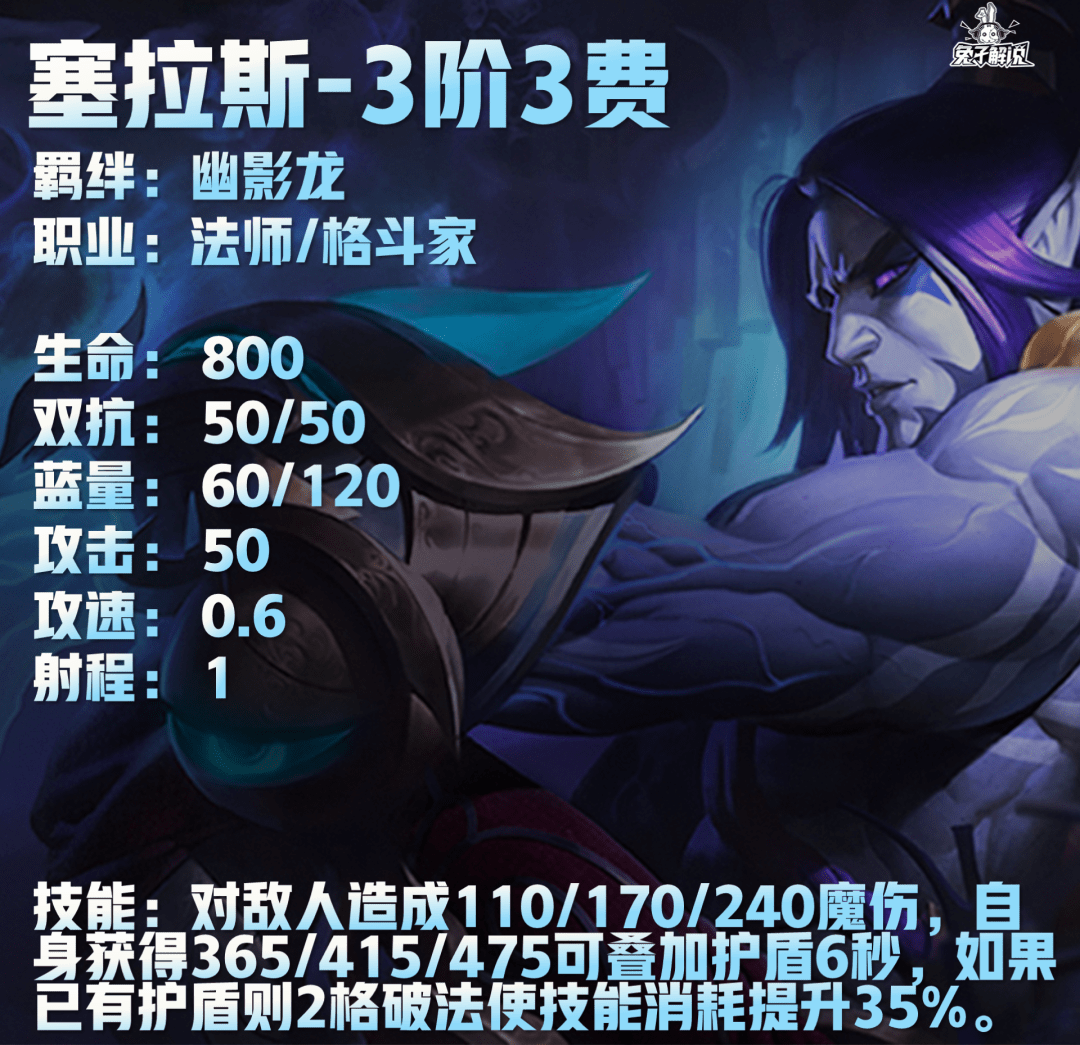 技能:对敌人造成110/170/240魔伤,自身获得365/415/475可叠加护盾6秒,如果已有护盾则2格破法使技能消耗提升35%。