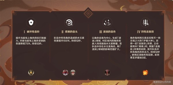 浸润的音色:生成「浸润」领域,持续水元素附着。若队伍中存在水元素角色,领域扩大。