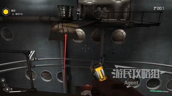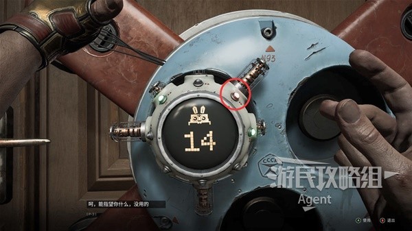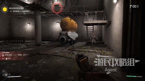 走上黄罐子旁的楼梯,楼上的门里有安全屋,打开圆盘锁是通往回去的路。