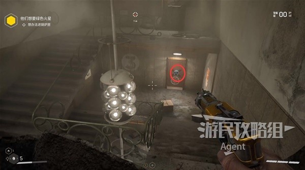 跳过墙上的洞来到楼梯道,这个带圆盘锁的门是回去的路,先打开然后继续走楼梯下楼。