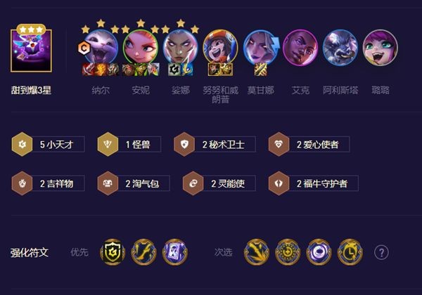 5天才的减伤配合琴女莫甘娜的奶控,克制那些输出低、怕控制的近战阵容,中期纳尔带5天才的减伤场面全2就能连胜,后期吃鸡要看三星卡的数量。