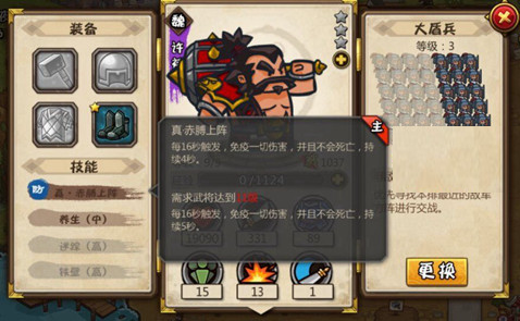 盾兵作为前排非常的强势,高防御让盾兵能够为后方的策士弓兵提供更好的输出环境,一般只要获得了盾兵名将都可上场!为了提升武将的防御力可以优先选择盾兵3白毦军,在后期如果搭配了足够的医生部队,可以考虑盾兵2!
