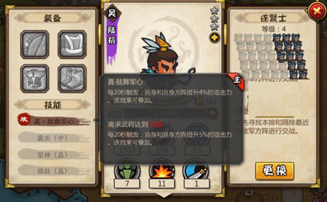被动技能:部队暴击提升、自身攻击提升、部队攻速提升;