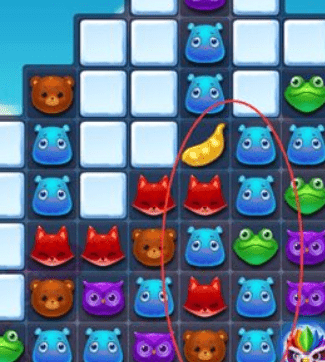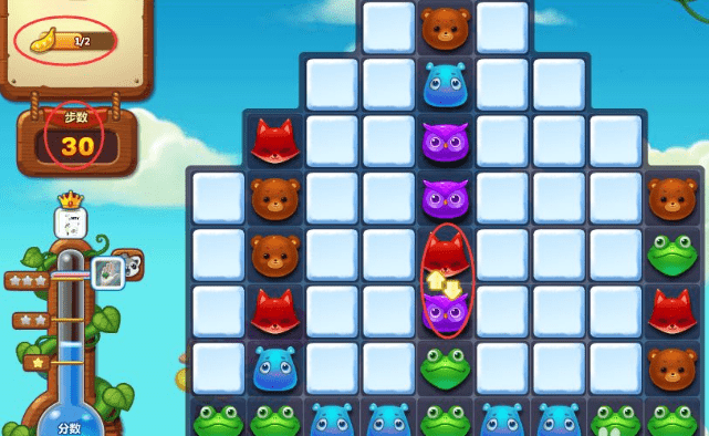 先来看看这一步的关键,是二颗豆夹掉下来,就赢了,其实是没有什么难度过关的,所以过关基本上是都能过,28步二颗豆夹,所以不难,难就难在四星,要高分,还有在第一步也很重要,我们从右边的二个发光的绿色动物头一起消,会一步掉下第一个豆夹,也是从右边的二个蓝色的动物头开始消,一样的一步掉下第一个豆夹,这样留下的步数就多一点。如图所示。