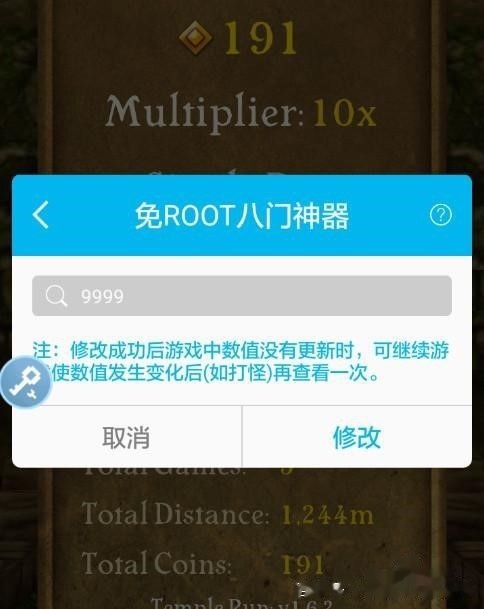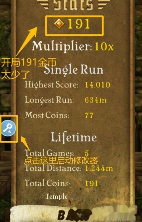 进入游戏后,比如说是“神庙逃亡”,那我们现在看到我们的金币有191个,那我们就首先点击屏幕左侧的八门神器的图标,在搜素框内搜索191