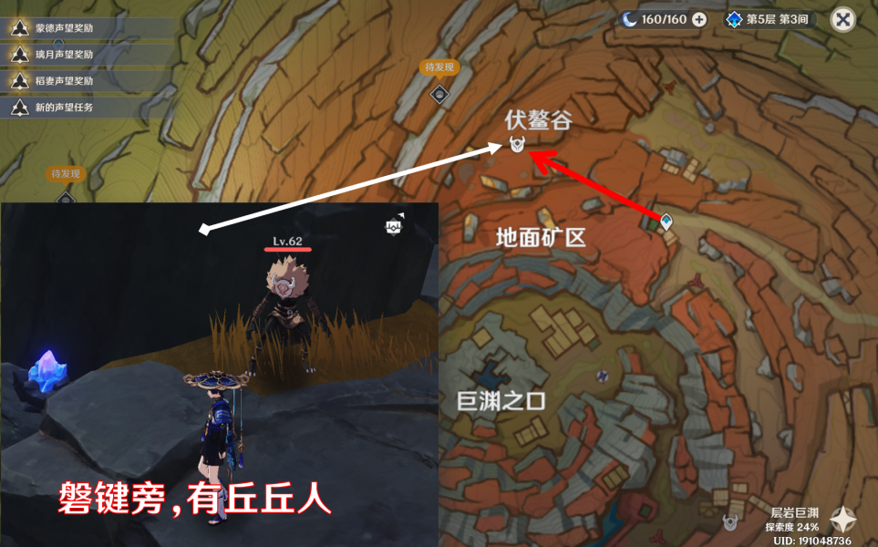 从地面处锚点进入矿洞,老石在磐键底部,边上还有个丘丘人。