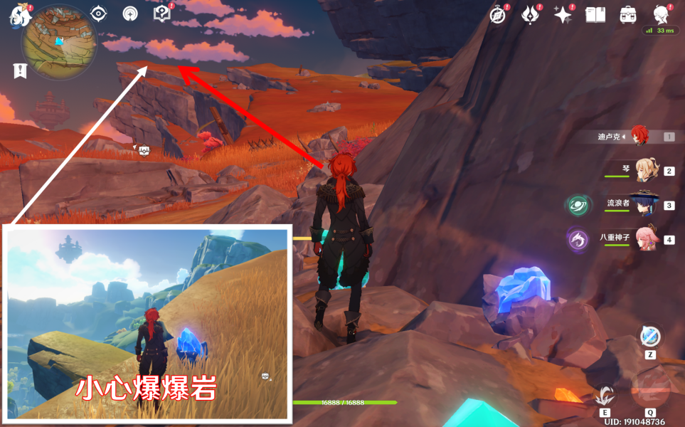 顺着东方的山坡前进,在顶峰的地图边缘;周围有三个岩爆爆瓜,千万小心别被炸下去!