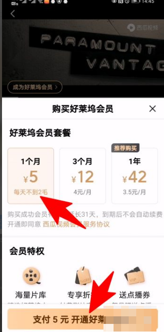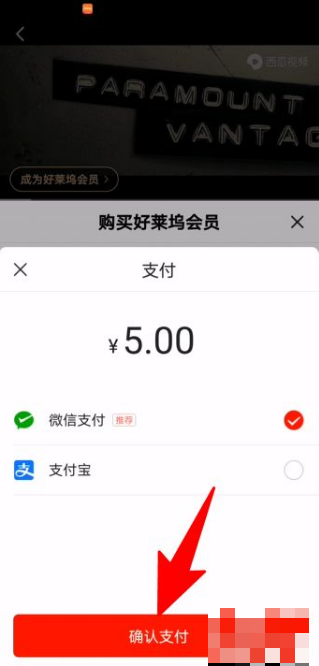进入支付页面选择支付方式,点击确认支付,输入密码之后就可以开通西瓜视频的好莱坞VIP会员了。