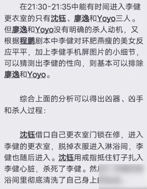 之后根据在场道具的情况可以断定,直接凶器就是钉子或者去死皮刀。同时完成凶杀还需不破坏的情况下直接进入李健或者沈玉的更衣室。和弄到李健或沈玉的指纹。那么凶手只有可能是沈玉了。