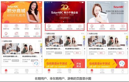 在页面的设置上,TutorABC APP充分体现了人性化设计。针对在期用户(注册并付费用户)的页面为:视频专区/积分商城/单词本/精选好文/关于我们/全球师资/课程定制/免费公开课;非在期用户(仅注册未付费用户)的页面为:关于我们/全球师资/课程定制/免费公开课;游客(未注册用户)的页面为:关于我们/全球师资/课程定制/视频专区。