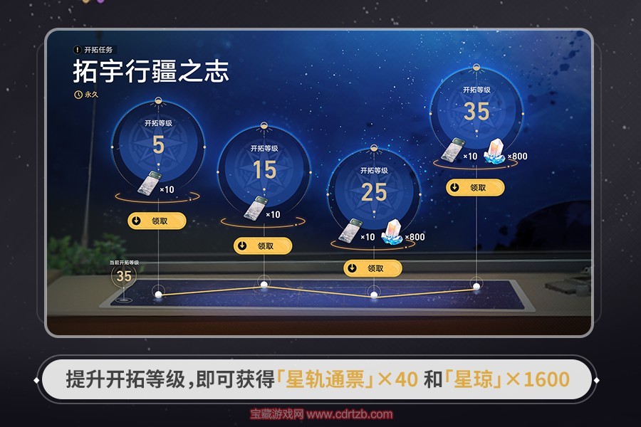 此外,游戏中还有开拓等级奖励,当用户达到35级时,可以获得星轨通票40张、星琼1600等奖励,这将为用户的冒险旅程提供很大的帮助。