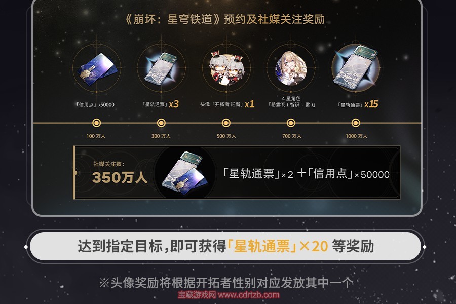 在公测期间,只要登录游戏7天,就可以领取10张星轨专票(UP池),同时,只要预约人数达到1000万,社交媒体的关注数达到350万,就可以获得星轨通票20张(普池)、信用点10万、开拓者迎新头像和4星角色希露瓦等福利。