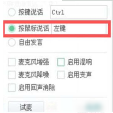 6.假如想用鼠标左键来作为按键说话的模式也可以的,只要在第4步骤中选择【按鼠标说话】-【左键】前面勾选一下即可。