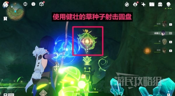 返回草元素方碑处使用健壮的草种子射击圆盘。即可开启通往秘境的路。