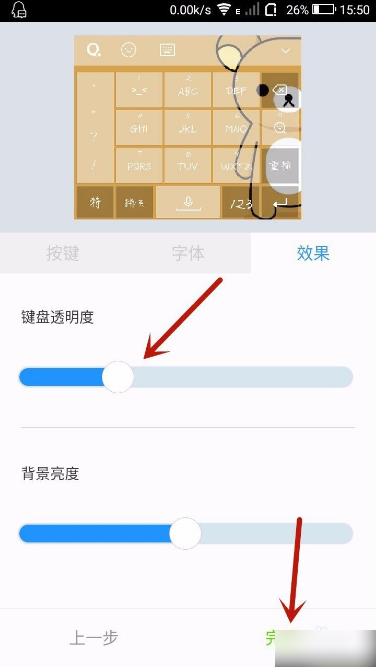 最后一步,添加键盘和背景的透明度点击“完成”QQ输入法皮肤就更改完成了