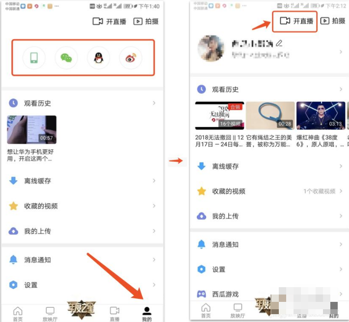 进入到西瓜视频「我的」页面中, Android手机用户点击右上角「开直播」按钮