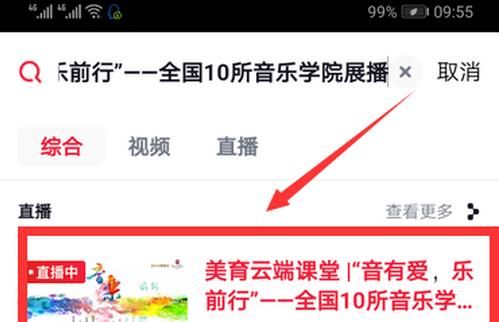 5、点击搜索结果“美育云端课堂”,点击“直播中”字样“美育云端课堂”。
