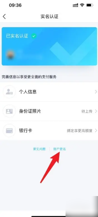 最后,如下,在身份信息中,点击下面的【账户更名】即可更改身份证实名认证