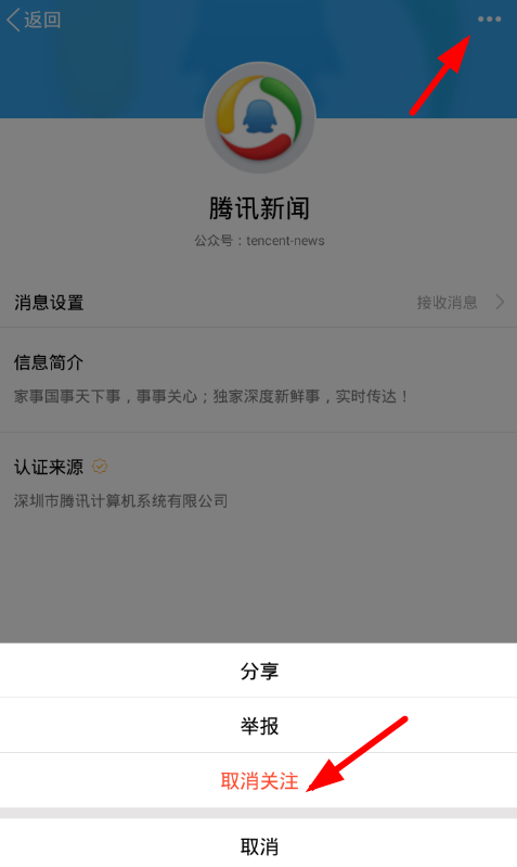 2、接下来点击进入“腾讯新闻”的公众号页面,从页面的右上角点击进入详情页面,即可设置取消关注。
