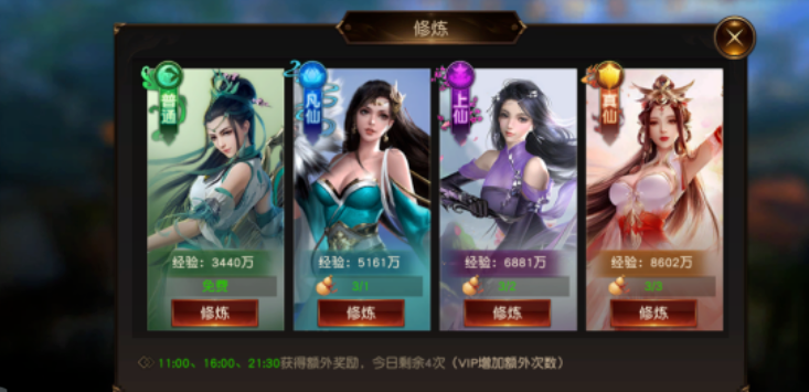 野榜的奖励只会保留一次。如果当天没有收到奖励,第二天会将当前奖励重置为223,336,000。错过了就少一个奖励。建议即使不打野单也要每天领取排名奖励。关于挑战环节,尽量选择能在大野榜挑战中击败它的对手来尝试尽快提升自己的排名。另一方面,虽然对手都是对面的用户,但不是自己操作,而是自动战斗。所以,如果你遇到一些平时打不过但战力相差不太大的人,不妨尝试在野榜挑战一下。练习:可以24小时练习,根据不同的vip等级会有不同的练习次数。有四个层次的练习。*关普通修炼不需要道具,第二关成仙修炼需要一颗修炼丸,第三关成仙修炼需要两颗修炼丸,第四关成仙修炼需要三颗修炼丸。每天有三个时间段在练习中获得双倍经验,11:00-11:30,16336000-16336030,22336000-22336030为双倍练习时间。