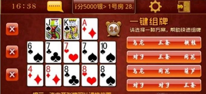 3.然后按照从第一部分到第三部分的顺序比牌的大小,玩这个不比花色,纸币牌型大小就好。这个分牌时一定要按照第一部分小于第二部分小于第三部分的顺序来。